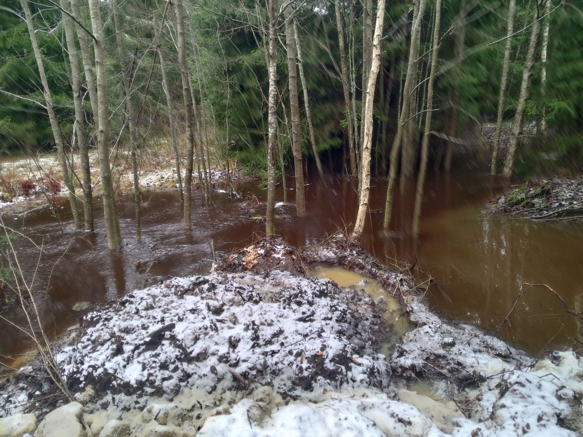 Täytyy käydä kaivamassa oja tuohon myllätyn hetteikön viereen ja mättää kaivumaat tuon sotkun päälle, siitä kohtaa kun mennään vieressä (oikealla) näkyvän ison ojan ylityskohtaan johon pitäisi myös väsätä kunnon rumpu, 80cm vähintään renkaiden halkaisija. Ei raaski ostaa muovirumpua, maksaa yli tonnin, käyttö on niin vähäistä että hakusessa vanhoja käytöstä poistettuja betonirumpuputkia.