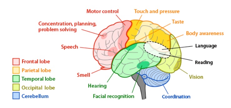 Kuten sanoin, aivokuvista ei näy ykseyttä, subjektiivisuutta tai objektiivisuutta. Siellä ei siis näy yksittäisiä ajatuksia, vaan se, että ajatuskone ylipäätään toimii. Lisäksi voidaan karkeasti luokitella ajatuksien luonnetta eri aivolohkojen perusteella, mutta sekin on summittaista, kuten alla olevasta kuvasta näkyy.