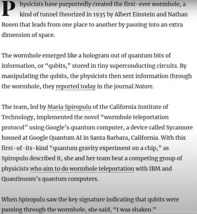 "Physicists have purportedly created the first-ever wormhole, a kind of tunnel theorized in 1935 by Albert Einstein and Nathan Rosen that leads from one place to another by passing into an extra dimension of space."