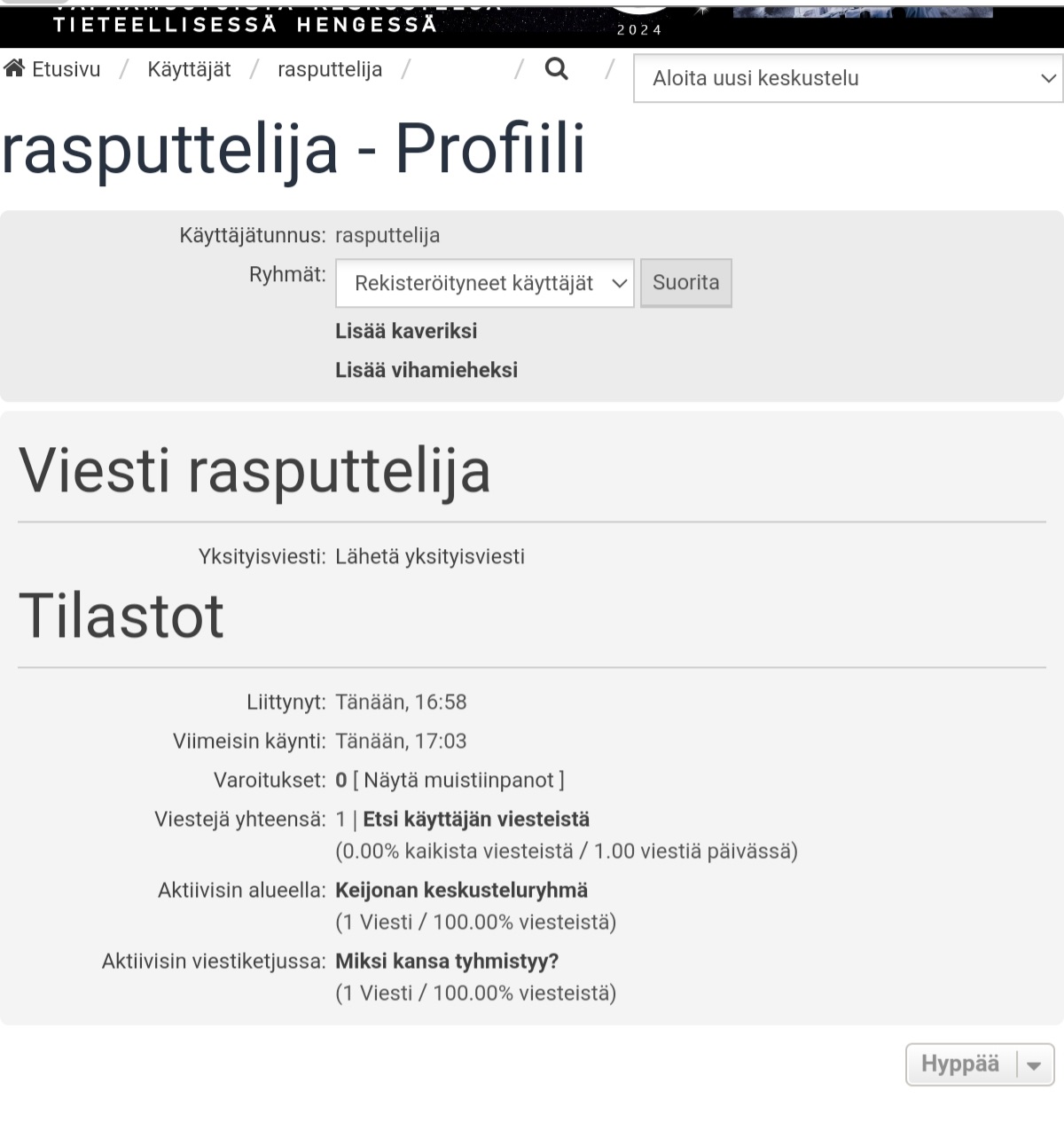 Minkäänlaista häiriökäytöstäkään ei viestihistoriasta näy, ihan asiallisia viestejä. Saattaa olla esimerkiksi joku tuttu kirjoittaja vanhalta palstalta joka ei kirjoittele täällä toisella nimimerkillä, siellä oli ainakin nimimerkki rapsutin joka on hyvin lähellä tota. Tai saattaa olla joku ihan uusi tyyppi joka oli vahvasti eri mieltä kanssasi feministien roolista islamistisissa maissa.