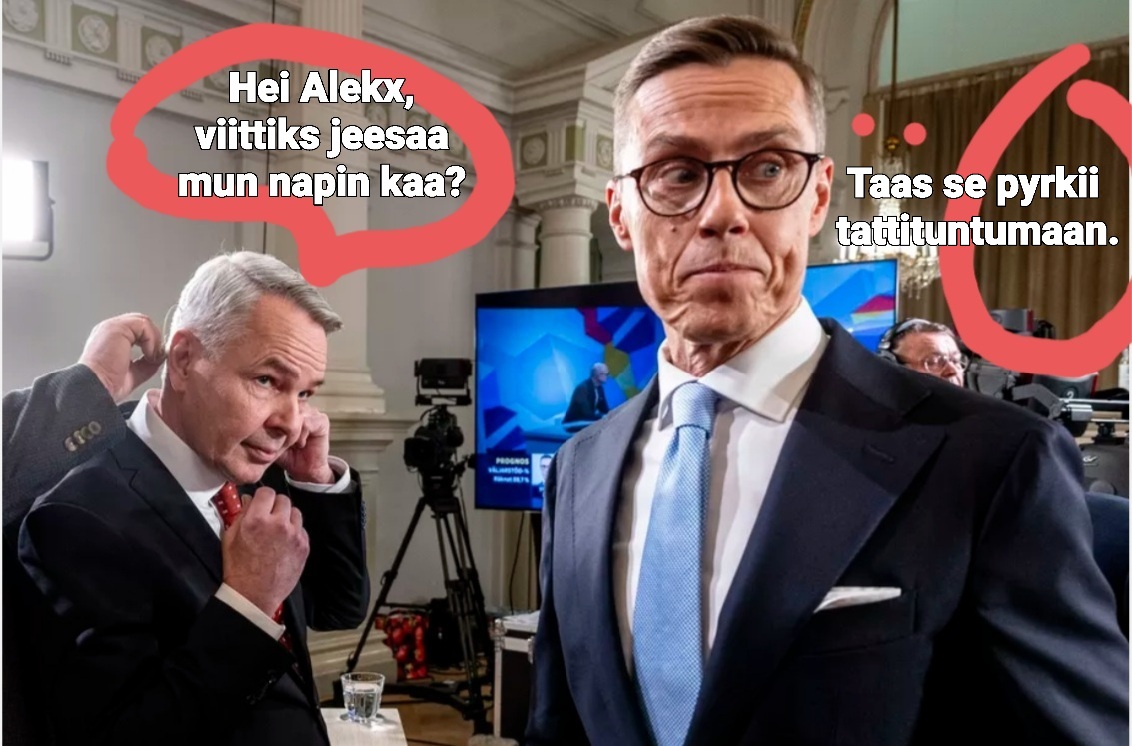 Homoläppähän on luonnollinen asia tila. Haavisto ajattelee: Luuleekohan toi et mä bluffasin uhatessani kertoa medialle Linnanjuhlien jatkoista.