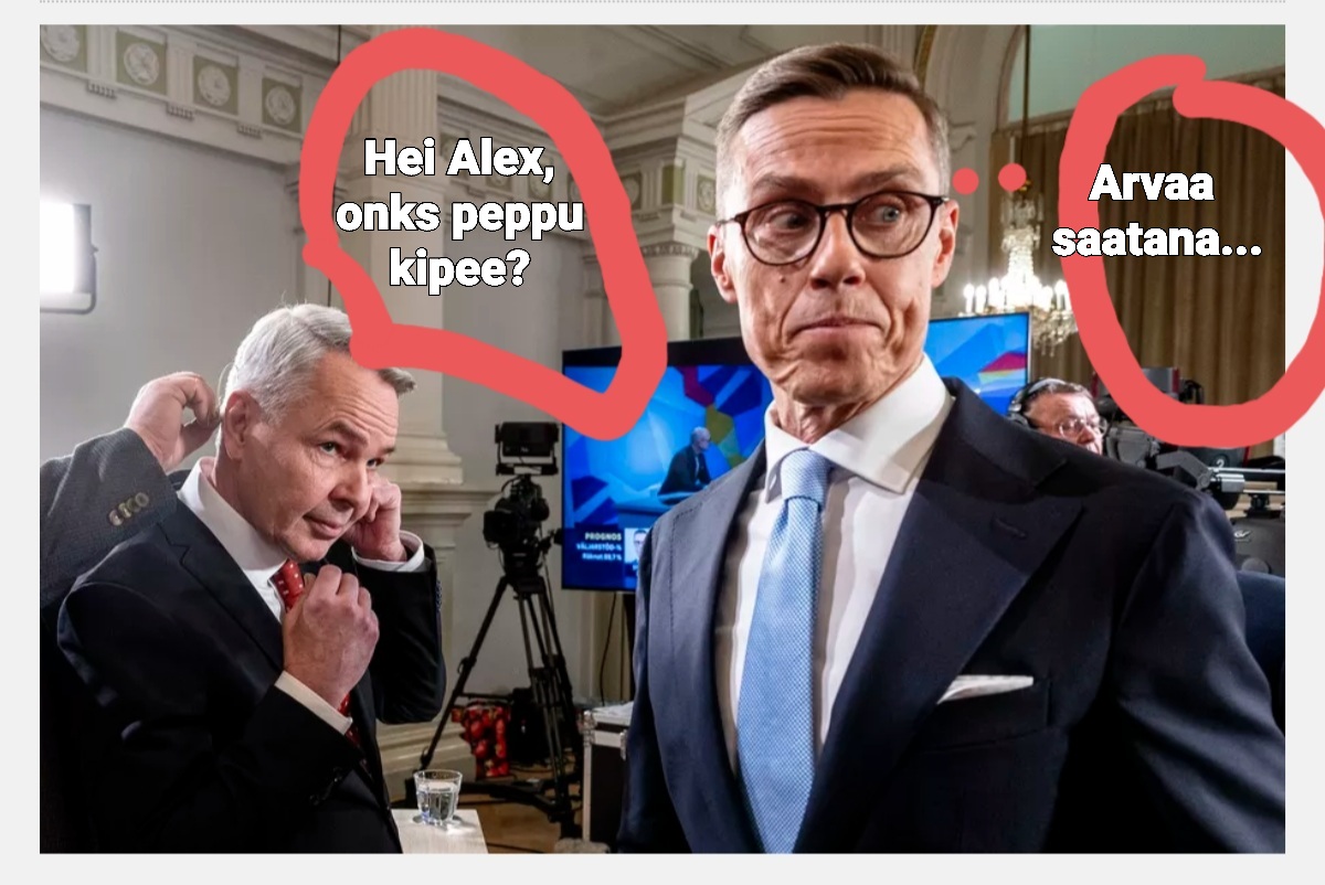 Stubb: Toivottavasti kukaan ei huomaa että ryppyjeni kanssa näytän noin 78 vuotiaalta...dementiaa pukkaa mutta muistan sentään nimeni...Urpo....vai Orpo...vai kuka se oli ?