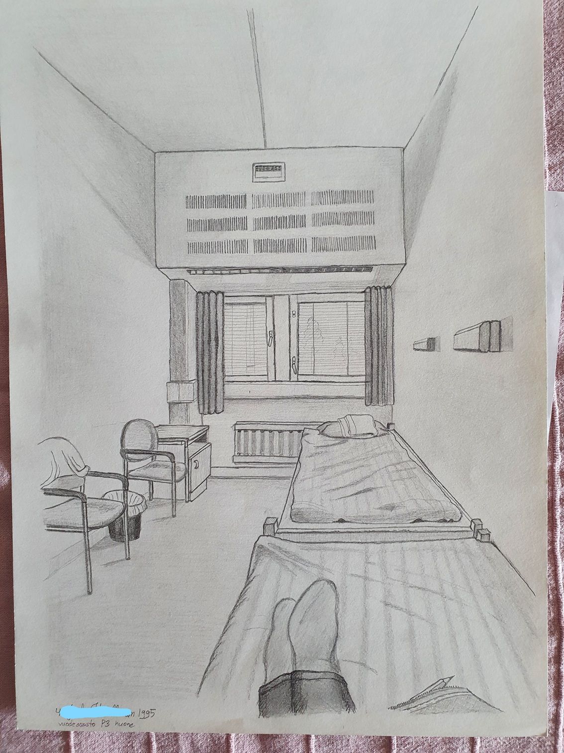 Mitä omaan piirtämiseen ja maalaamiseen tulee olen täysin itseoppinut ja työt on tullut tehtyä hävettävän vähäisellä harjoittelulla jos sitä on ollenkaan. Osaltolla usein piirtelen. Jopa muotokuvia jos joku potilas siihen suostuu ja erehtyy. Kuvia ei suljetulla saa mielellään ottaa mutta mites piirtäminen? Kuva on tour number onelta 1995 ja olin nyt kaksi huonetta käytävää eteenpäin. Tämä huone on toimiston vieressä. Ja piirretty muuten juuri noin kuin piirtäjä sitä piirtää eli selälteen maaten (Tai istuen selkä nojaten seinään?).