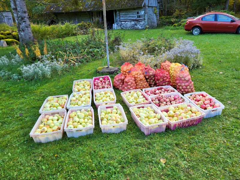 Pääsyy miksi mentiin maatilalle: Omenia keräämään siis, - saatiin kaks kertaa tää määrä ja vietiin omena-puristamoon. Tuloksena 520 litraa tuoretta omenamehua.