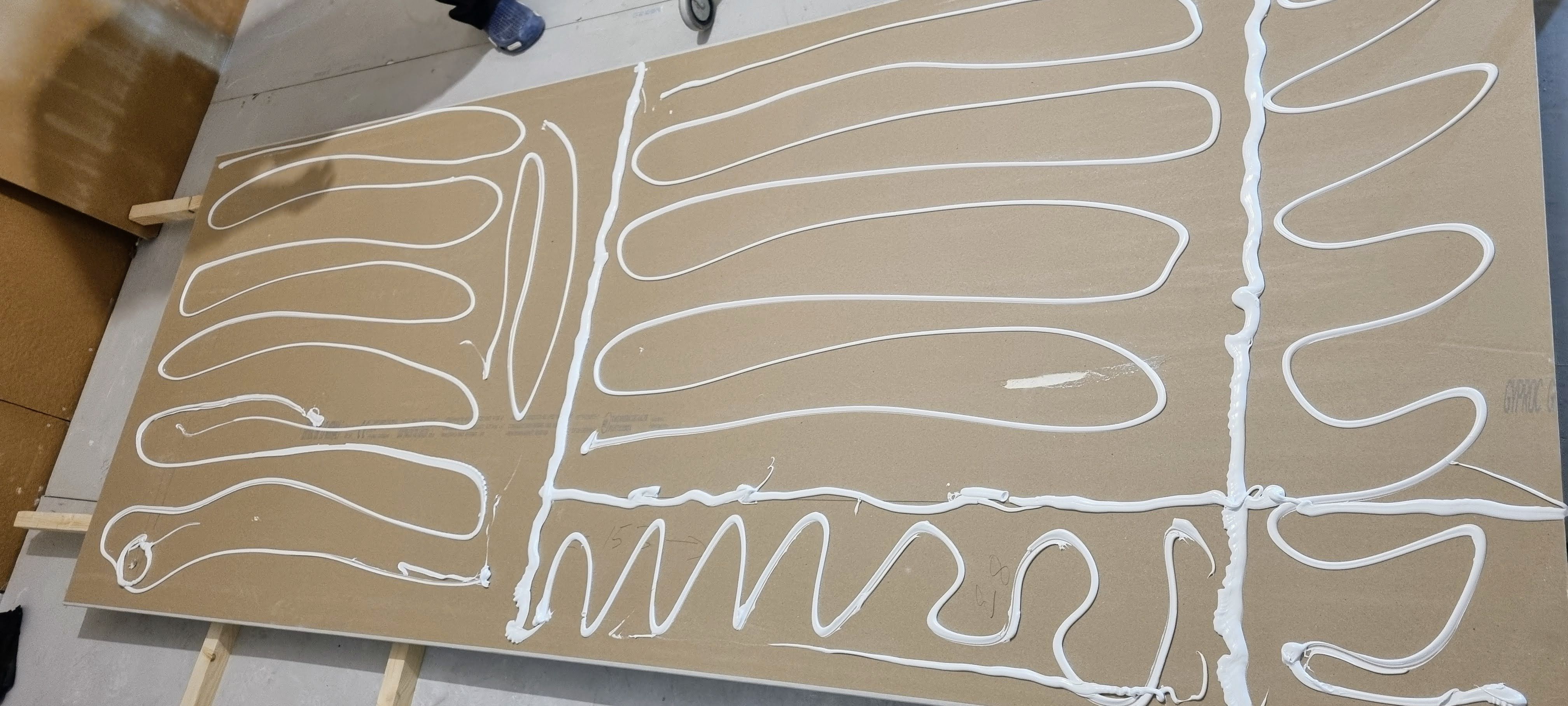 2.5 tuubia liimaa per 1200x3000 levy eli tuubi per 1.4m2 olis ohjeen mukainen määrä mut huone ei ole täysin suorakulmainen ja ekassa levykerroksessa oli niin isoja rakoja et meni vähä enempi. Seuraavissa kerroksissa on sit paljon pienempiä rakoja ja liimaa menee toivottavasti vähemmän ettei lopu kesken. Levyjen saumojen kohtaan kunnon paksu raita ja muualle ohkasempaa.