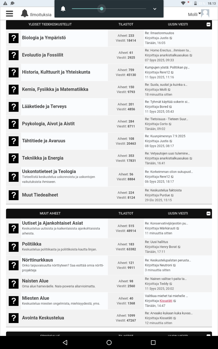 Muassa kuva tällä käyttäjällä näkyvistä "Yleiset tiedekeskustelut" aihealueista..