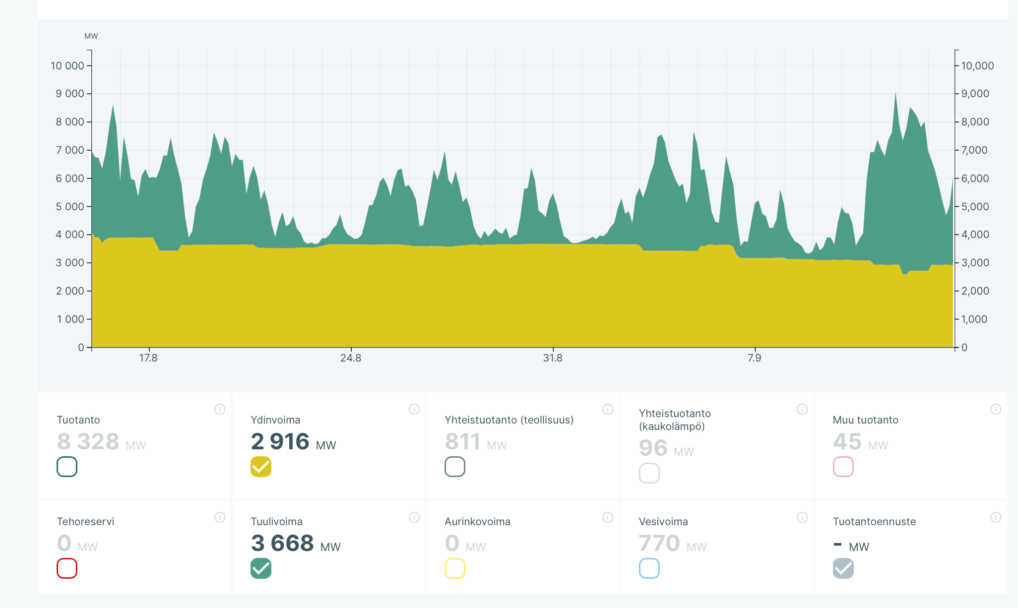 Valitsin kuukauden ajanjakson ja otin näkyviin pelkästään ydinvoiman tuotannon. Eikä siinä kyllä ihan kauheasti näy mitään vaihtelua. Aika tasaista graafia.