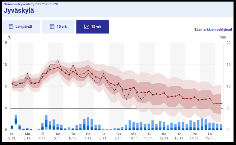 Tuo Ilmatieteen laitoksen 15 vuorokauden ennuste kertoo hyvissä ajoin etukäteen milloin kannattaa vaihtaa. Esimerkkipaikkakunnaksi valittu Jyväskylä: