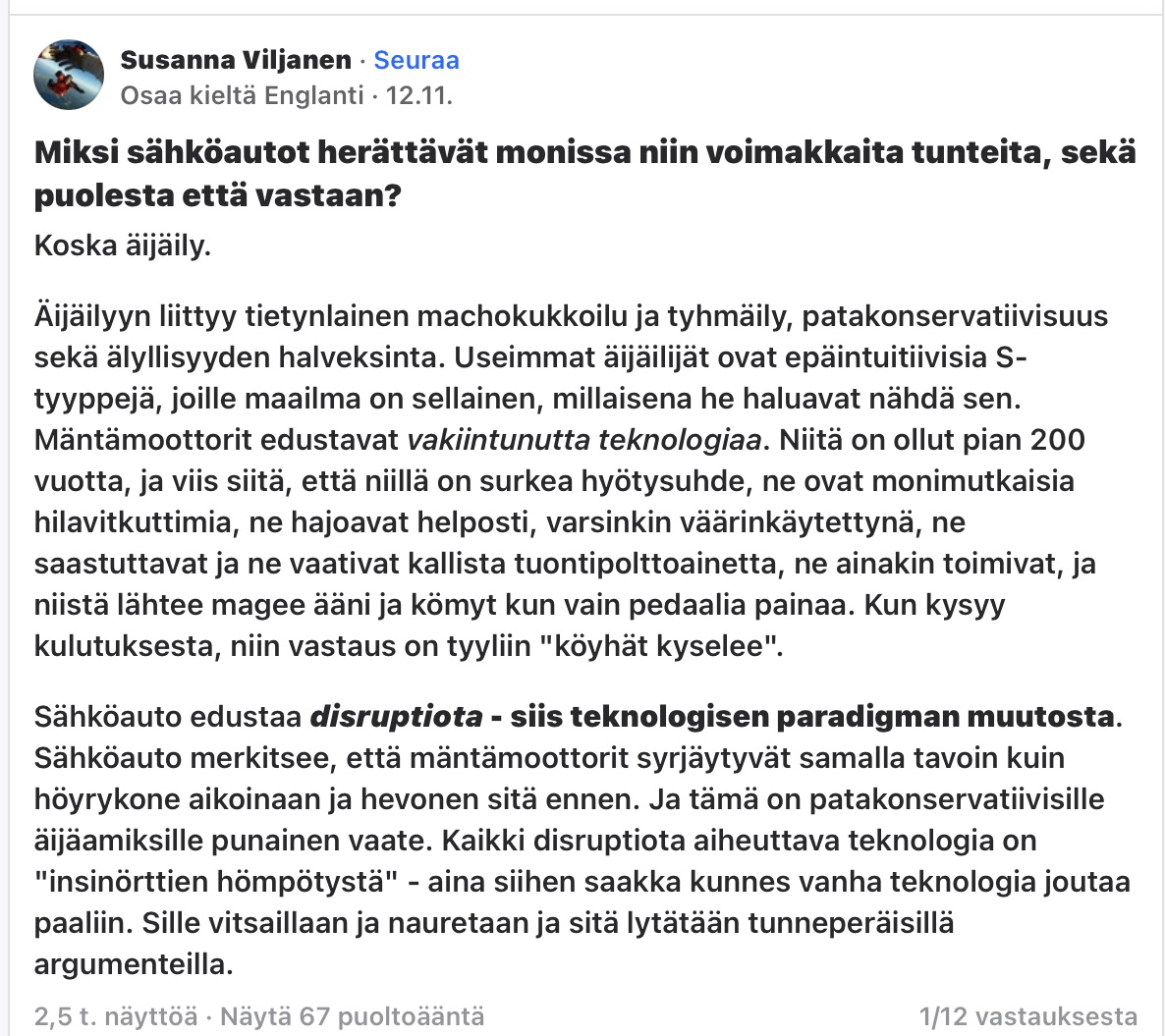 Onhan se tietysti noinkin. Naiset, homot ja tekniikasta ymmärtämättömät kädettömät nörtit ostavat sähköautoja. :lol: