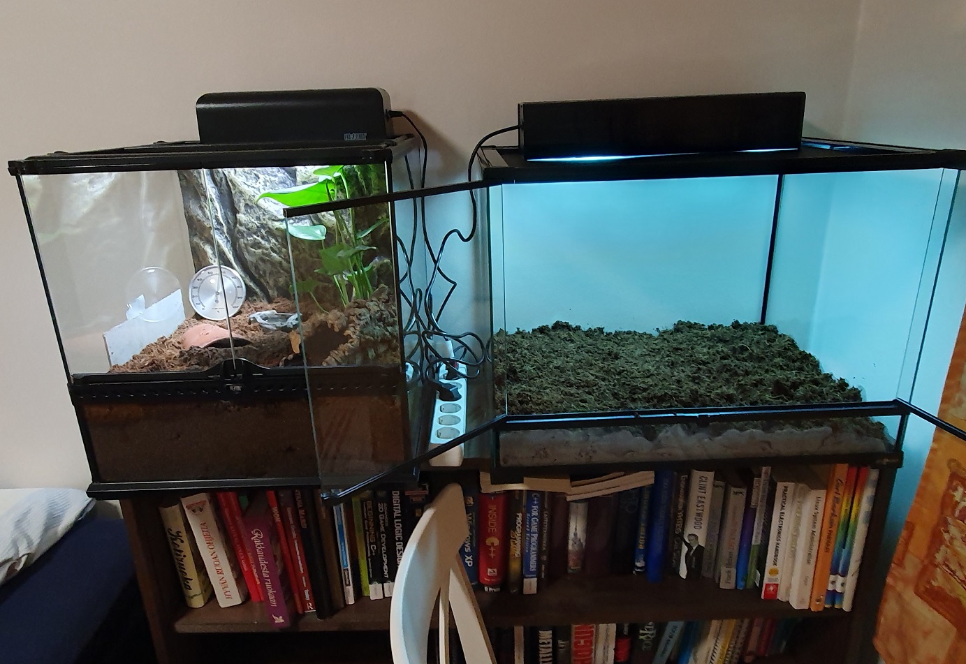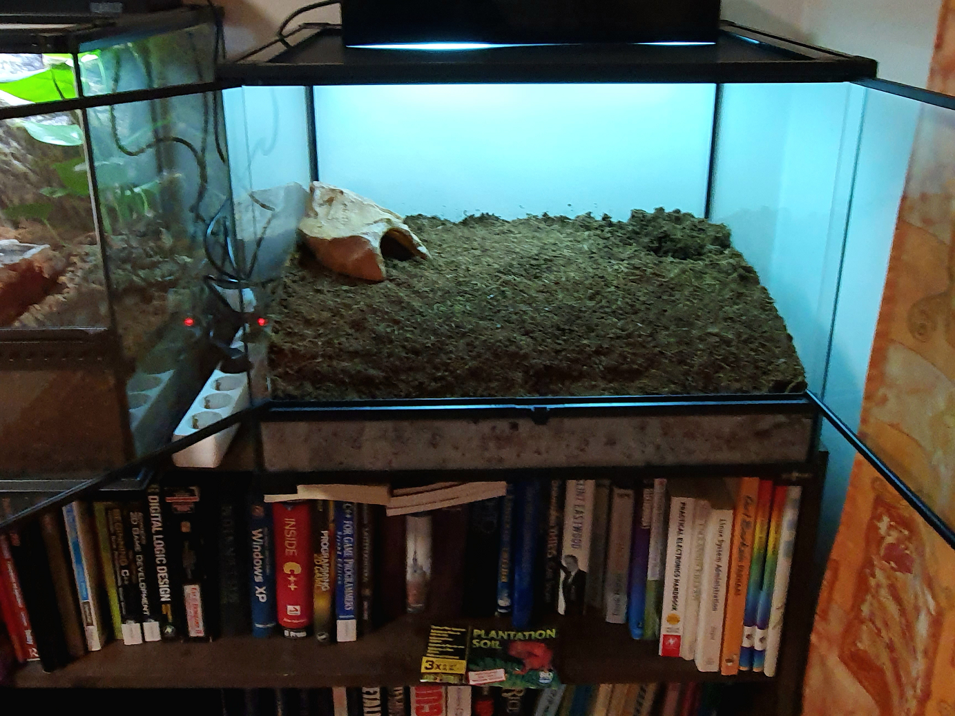 Pääosa työstä tehty. Liotin viisi turvetiiltä. Lähinnä sen takia että lasiodoran on tarkoitus muuttaa tuohon isompaan terraarioon. Turvetta tuli sellaiset 40 litraa joten Diggerillä on mitä kaivaa. Täytynee katsoa joku viherkasvi ja juoma-astia. Ensiviikolla tulee Brachypelma hamorii. Kutsuttiin ennen smithiksi mutta nyt on kuulemma hamorii.