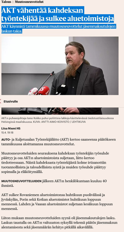 AKT vähentää kahdeksan työntekijää ja sulkee aluetoimistoja