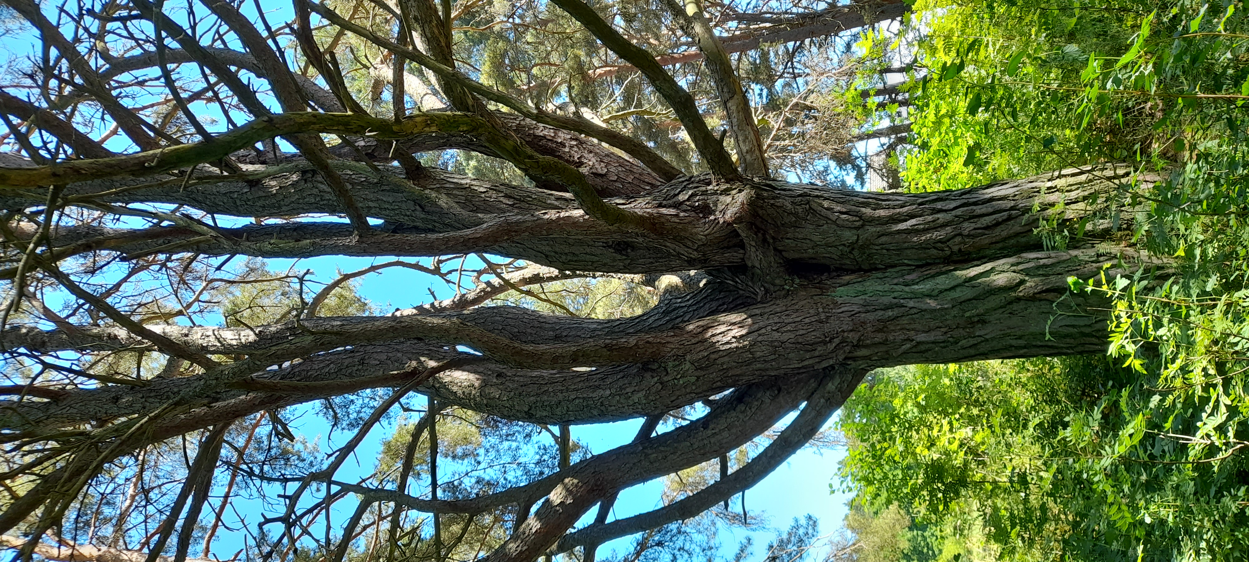Koristeomenapuu malus, valkea kuulas omenapuu, koivu, kataja ja muita havupensaita ja yks joutopuu, joka on vuorimänty pystyyn kasvanut ruma ja osittain kuivunut....