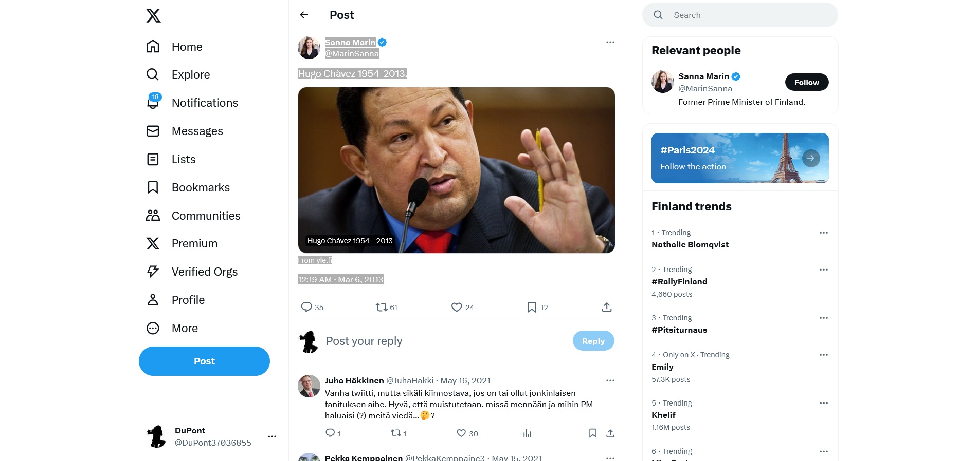 Eikö Sanna Marin ole vain lievempi versio Chavezista? Samaa sosialismia loi ja nyt paistattelee sometähtenä mediassa. Meidän Sanna, vitun pelle hän on.