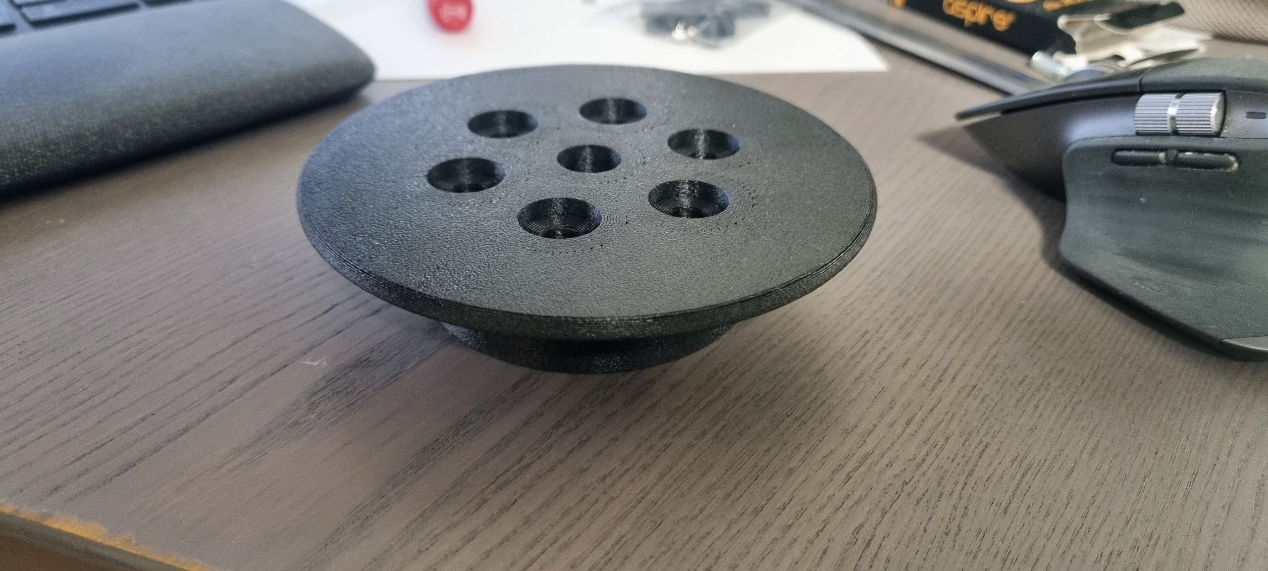 Tein yhden pienen testiprintin ensin, 200€/kg kamaa ei oikein viitsis törsätä pilalle menneisiin printteihin väärien asetusten takia. Kuulostaa ihan metalliselta mutta näyttää muovilta. Pitäisi olla lähes alumiinin veroista.