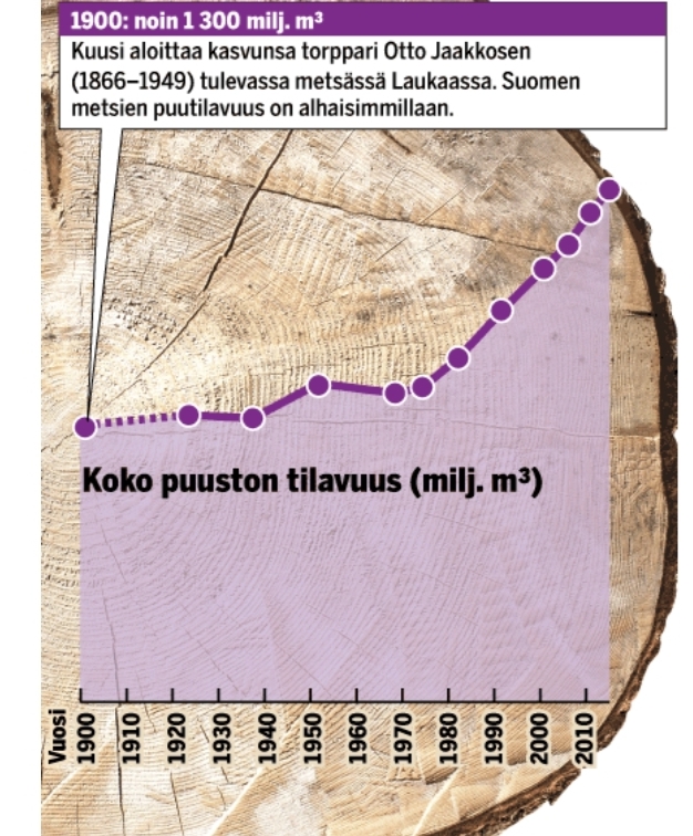 Ja mitäs kaupungit on tehneet ympäristön eteen? No helsinkiläiset on keksineet tällä samalla aikaskaalalla kivihiilenpolttamisen kämppien lämmittämiseksi, eikä siitä vieläkään ole luovuttu. Tätä kivihiilen verityötä ja ilmakehään tunkemista ei sovi unohtaa vaan helsinkiläisten on korvattava joka ikinen poltettu kilo. Metsänomistajat näyttää tehneensä oman osuuden paljoa enempää puuta ei tuonne metsiin enää mahdu. Tuosta puun tilavuuden lätkämailasta saisi hyvän korrelaation CO2 pitoisuuden kasvun kanssa, mutta tässä tapauksessa ilmastotutkijat vaatinee kausaalisuustodistuksen, mikä on ymmärrettävää, ja ymmärrettävää on ettei erästä toista muuttujaa vasten kausaalisuustodistusta luonnollisestikaan tarvita.