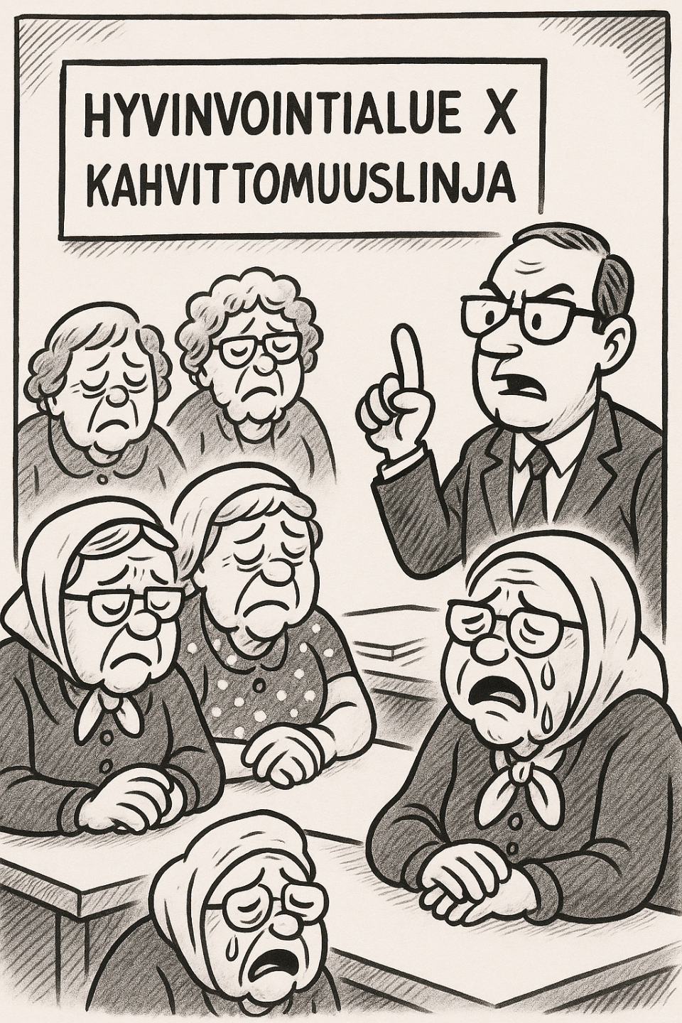 Olkiukko on se, että muokataan uutisesta väite, että mummojen kahvit on peruttu. Ja sitten pontevasti pilkataan tätä "päätöstä". Sen sijaan siis, että arvosteltaisiin sitä, että vapaaehtoisille virkistystä tuoville ihmisille ei saa enää edes keittää kahveja kiitokseksi. Ja kahvitteluhan on paljon muutakin kuin palkkio vieraille, se on vanhuksillekin Tapahtuma ja juttutuokio vieraiden kanssa.