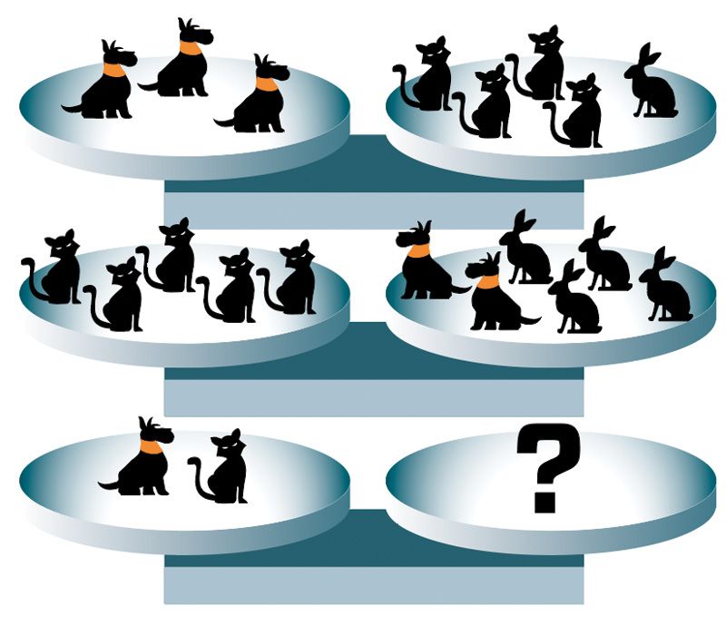 Ylemmät vaa'at ovat tasapainossa. Montako kaniinia pitää sijoittaa alimman vaa'an kuppiin, jotta sekin on tasapainossa?