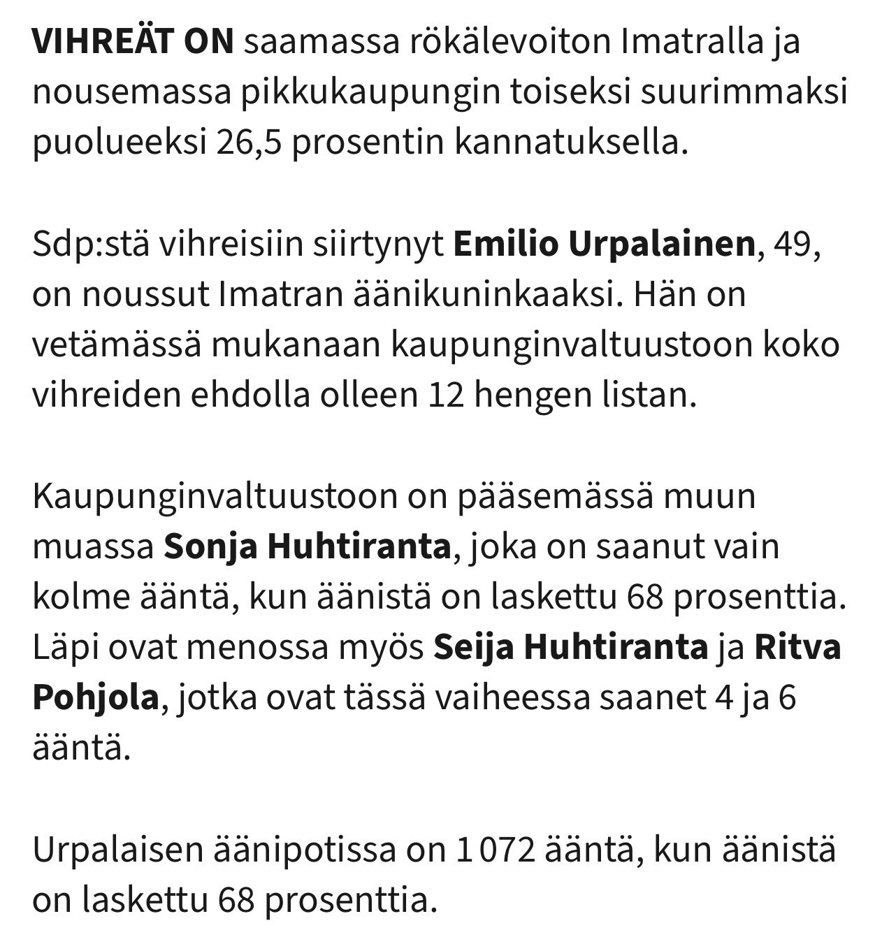 https://www.iltalehti.fi/politiikka/a/6 ... 7b579e7cc5Vihreiden puheenjohtajan, kansanedustaja Sofia Virran puheet puolisonsa metsän hakkuista vaikuttavat asiakirjalähteiden valossa vähintäänkin oudoilta tai mahdollisesti suorastaan perättömiltä.