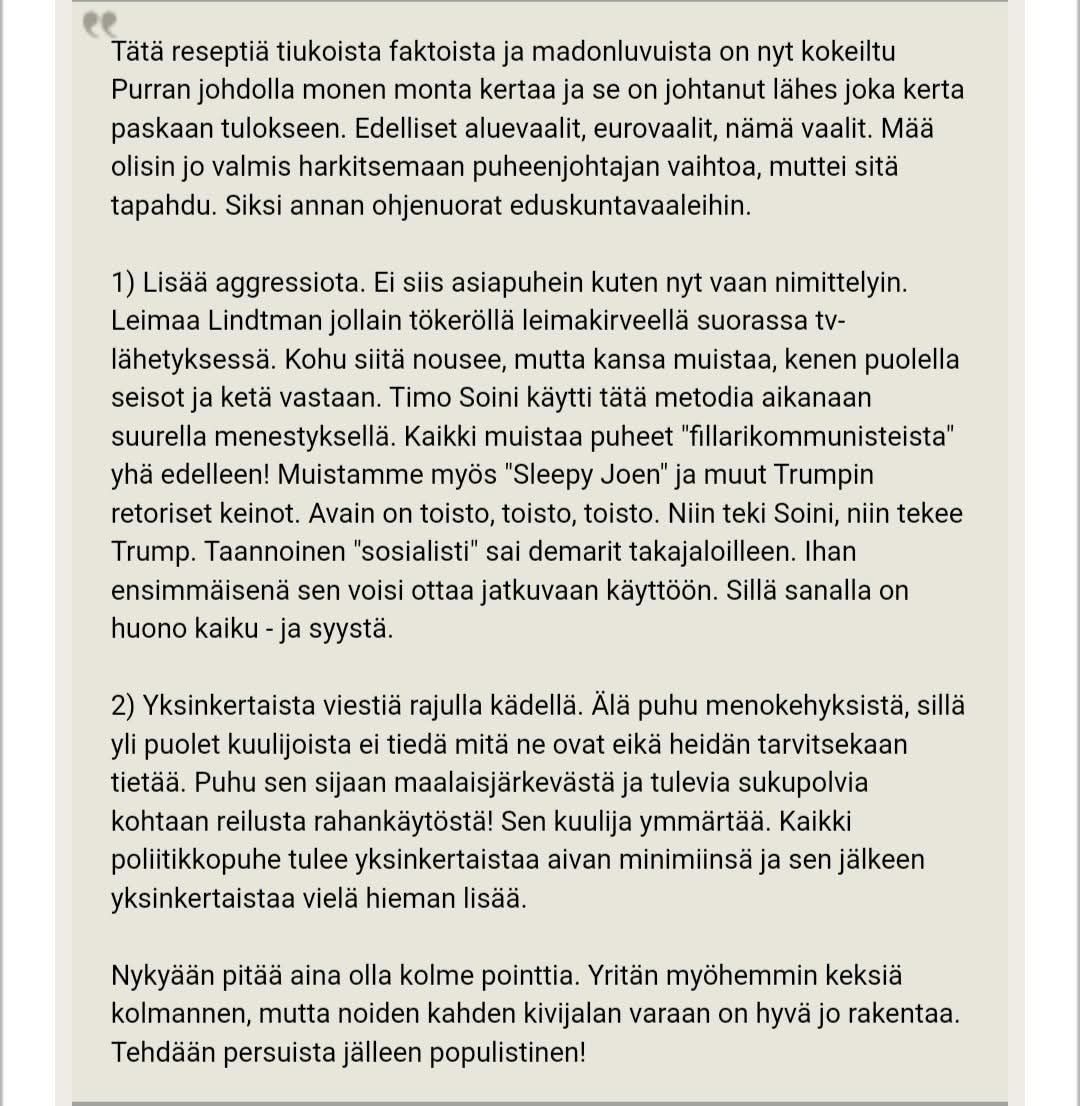 PS ei edelleenkään ole pedofiilipuolue, jos yhden tai kahden käden sormilla laskettavissa olevat kunnallisvaaliehdokkaat ovat aiemmin syyllistyneet seksuaaliseem ahdisteluun.Henry Borat kirjoitti: ↑04 Touko 2025, 21:38 Toisella maan älyllisen kerman kokoontumispasltalla, eli Hommafoorumilla yritetään kammeta jo Purraa pois puheenjohtajan paikalta ja Peltokangasta tämän pallille. Mauria ei poljeta, se on jämpti.
