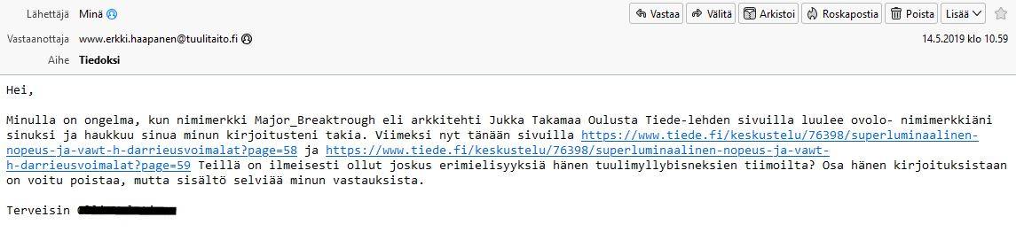 Yrität taas vääristellä asiaa. En antanut väärää todistusta. Vainoharhaisuutesi takia pidit minua silloin Erkki Haapasena, ja haukuit minua, joten tottakai selostin Haapaselle tämän minulle kiusallisen tilanteen. Kaikki kyseiset e-mailit ovat kyllä tallessa, joten ihan hukkaan menee sinun valehtelusi ja vääristelysi. Liitteenä ruutukaappauskuva kyseisestä e-mailista.