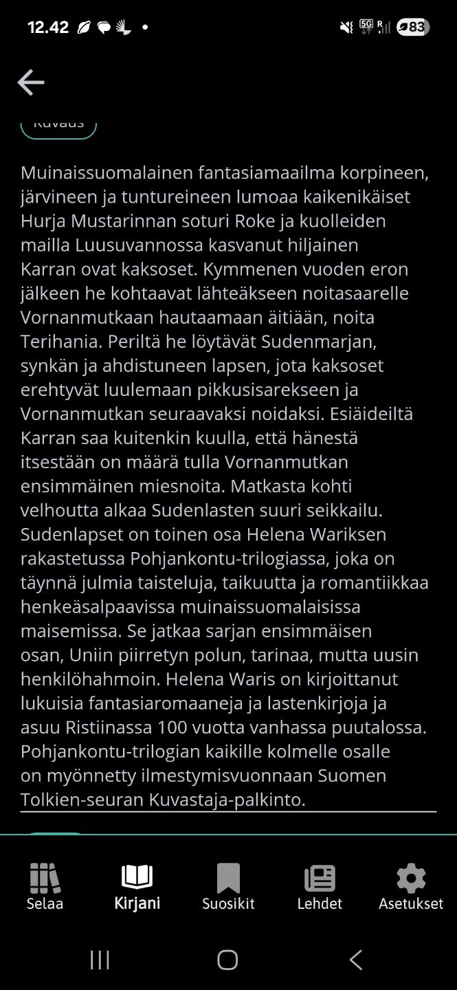 Helena Wariksen fantasiatrilogia. Luvussa olevan osan kuvaus e-kirjaston apista