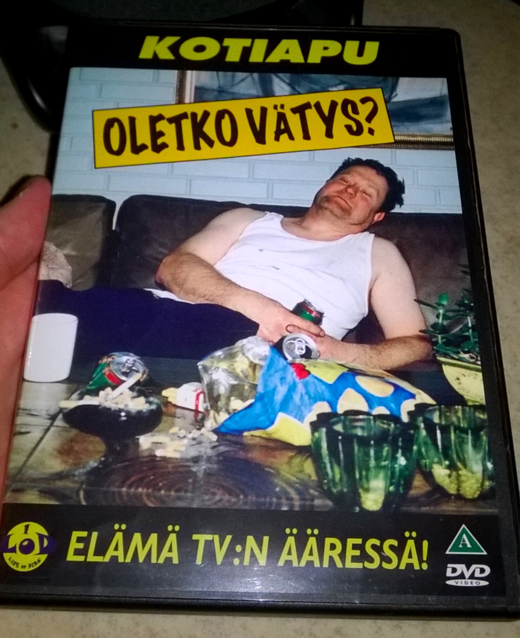 "Dvd vätyksille - Kotiapu" sisältää yli kahden tunnin edestä kaikenlaista videoitua kotiaskaretta kuten pyykinpesua, siivousta, ruuanlaittoa, pihatöitä ja kävelylenkin. Näitä kaikkia voi katsella itse mukavasti sohvalla makoillen! Takakannen still-kuvien perusteella odotan erityisesti paskapöntön jynssäystä.