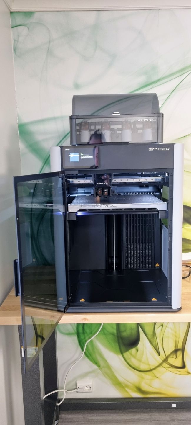 Ensin jo melkein tilasin Creality K2 Plus, mutta siinä oli youtuben mukaan kaikenlaisia lastentauteja ja odotin. Sitten Bambu Lab, jonka aikaisemmat tulostimet ovat olleet järjestään menestyksiä ja laadukkaita, julkisti alkuvuodesta uuden tulostimen ja päätin odottaa sitä tietämättä vielä hintaa. Oli lopulta vähän kalliimpi kuin Creality (joka maksaa n. 1300€), H2D maksaa n. 2000€. Mutta siinä on kaksi suutinta, joka on iso etu. Ensinnä sillä voi tulostaa nopeasti ja pienellä hävikillä moniväritulostuksia, mut vielä tärkeämpänä mulle multimateriaalitulostukset, esimerkiksi hiilikuitukomposiitti ja TPU kumi yhteen sulautettuna on aika käyttökelpoinen juttu erilaisissa systeemeissä joissa tarvitaan iskunkestävyyttä tai pitävää käteen miellyttävää pintaa. Lisäksi voi tulostaa tukimateriaalieja halvemmilla helpommin poistettavilla muoveilla. Tukirakenteita tarvitaan tietynlaisissa malleissa koska tulostin ei voi tulostaa ilmaan, vaan alla on oltava joko tulostimen aluslevy tai sitten edellistä muovikerrosta.