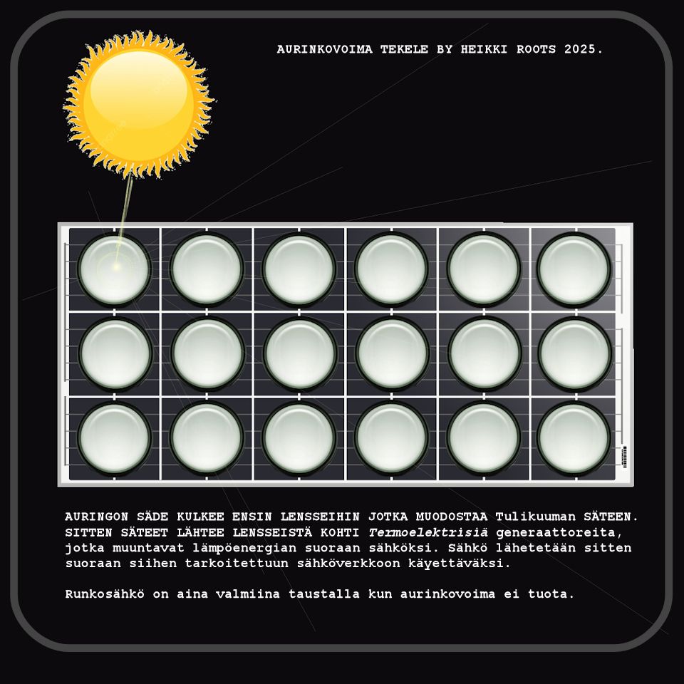Yläkuvassa mockup. Aurinko - > Lenssi - > Termoelektrinen muunnin - > Töpseli.